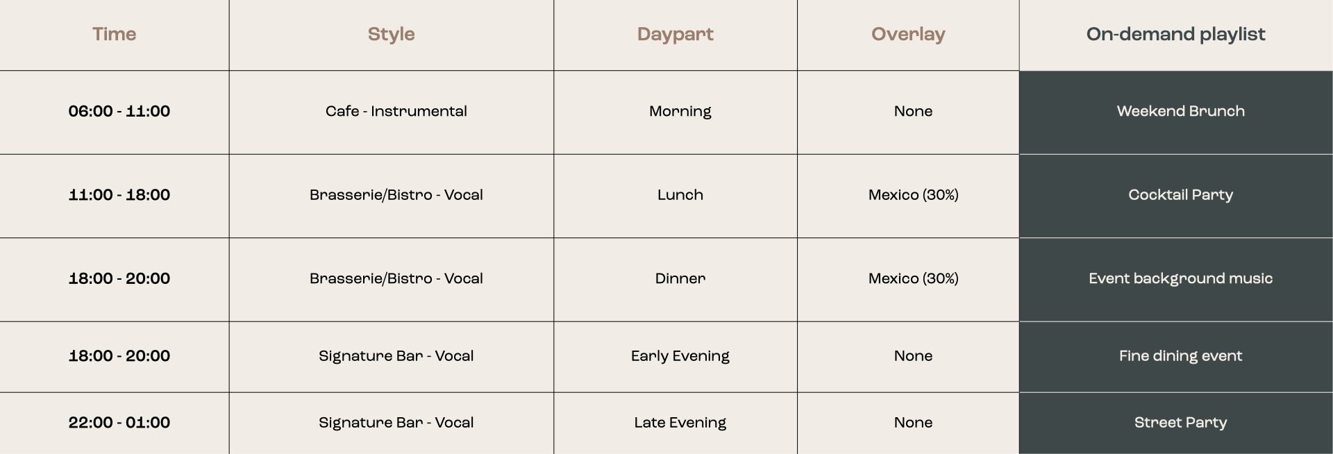 For instance, one of your F&B outlets might start with an instrumental cafe sound in the morning, which transitions to a lively bistro atmosphere in the daytime before evolving into a vibrant and buzzing bar ambience in the evenings.